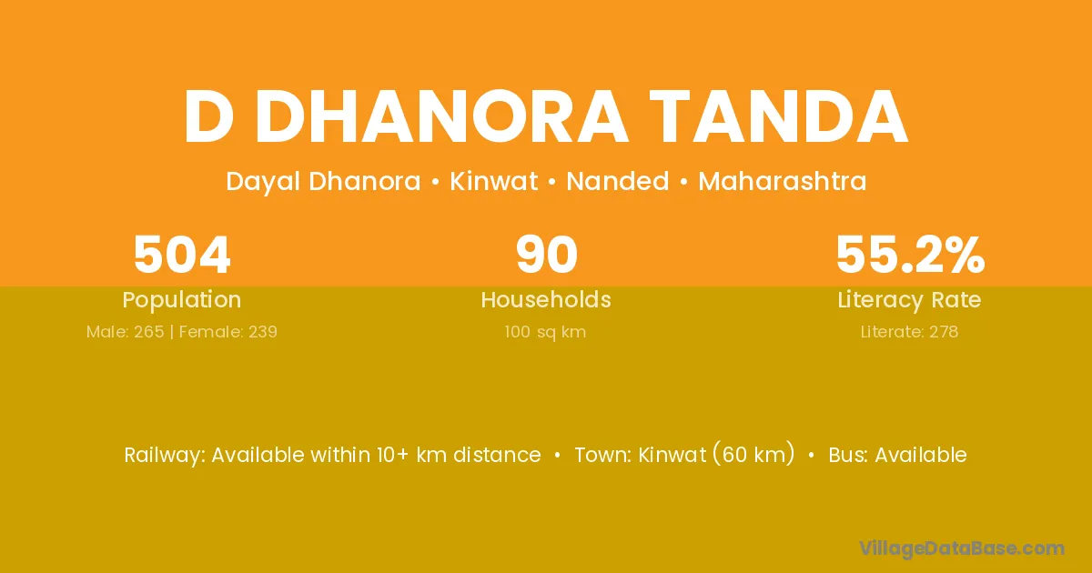 D Dhanora Tanda village has a total population of 504 people, of which 265 are males and 239 are females.