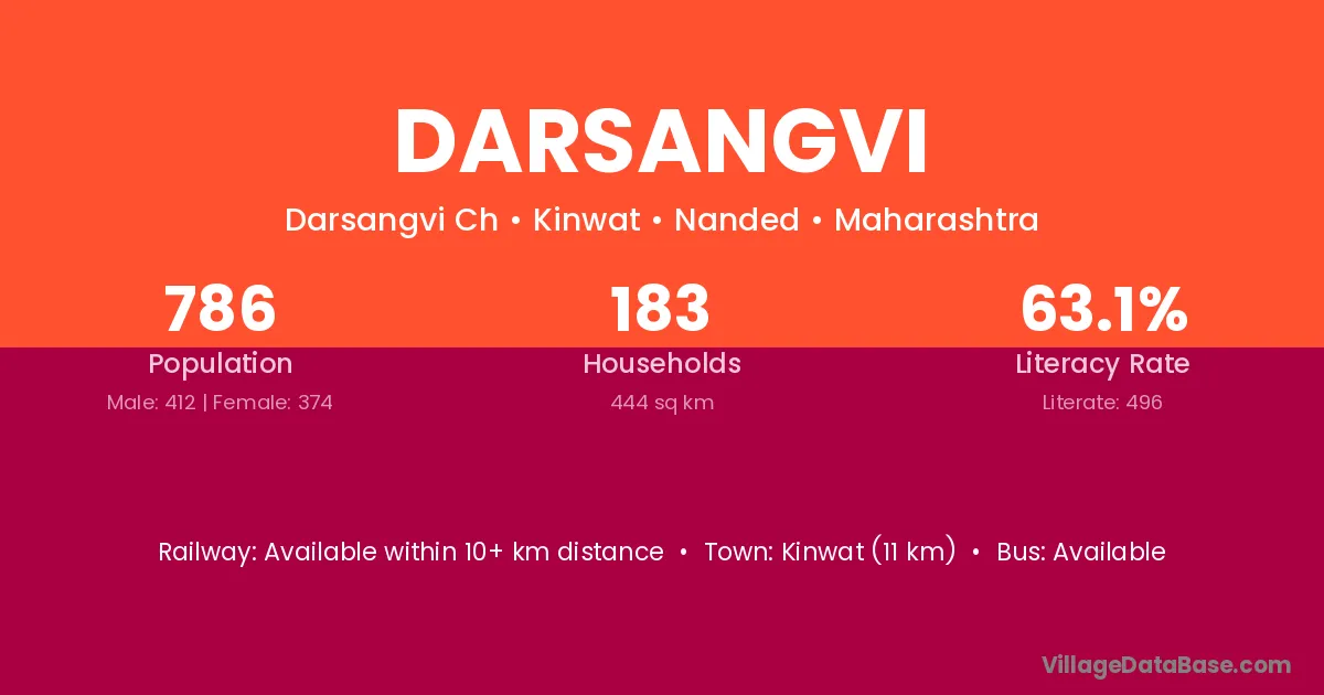 Kinwat (11 km) is the nearest town to Darsangvi village for major economic activities and is located approximately 11 km away.