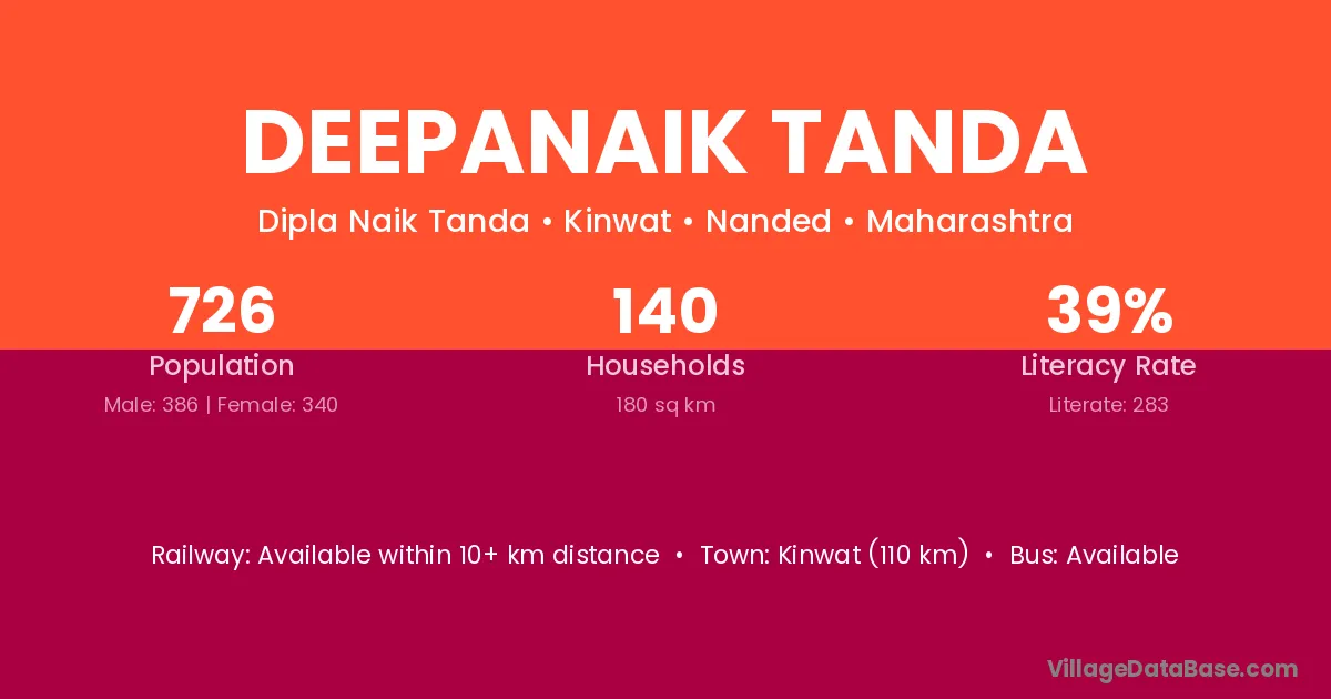 Kinwat (110 km) is the nearest town to Deepanaik Tanda village for major economic activities and is located approximately 110 km away.