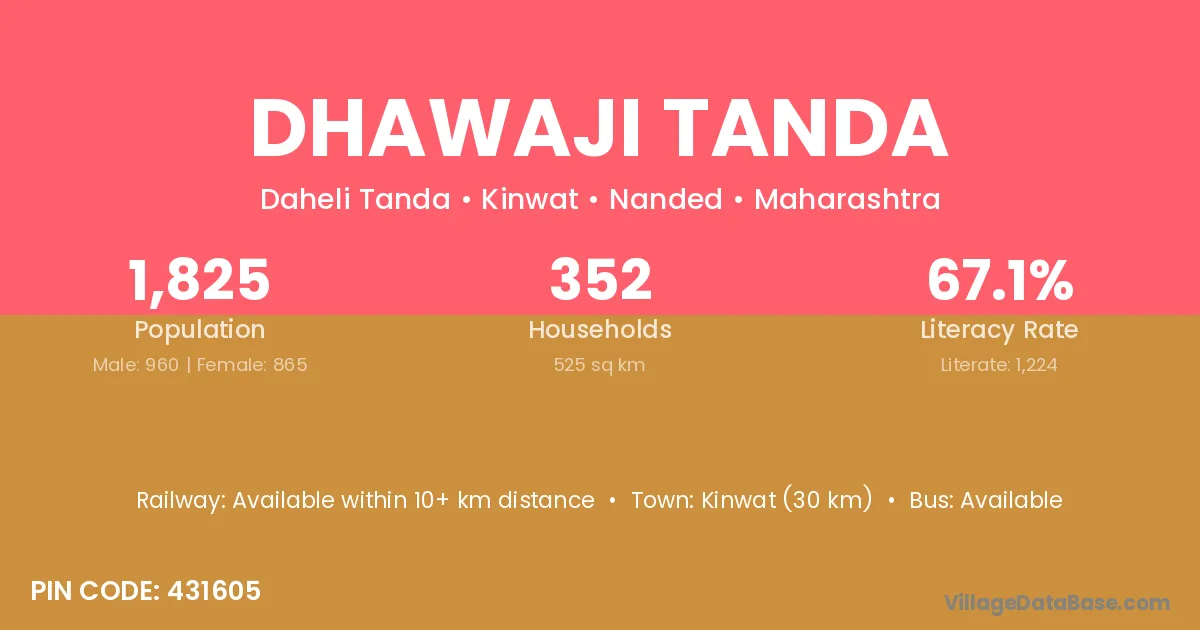 Kinwat (30 km) is the nearest town to Dhawaji Tanda village for major economic activities and is located approximately 30 km away.