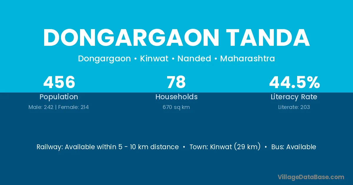 Dongargaon Tanda village has a total population of 456 people, of which 242 are males and 214 are females.