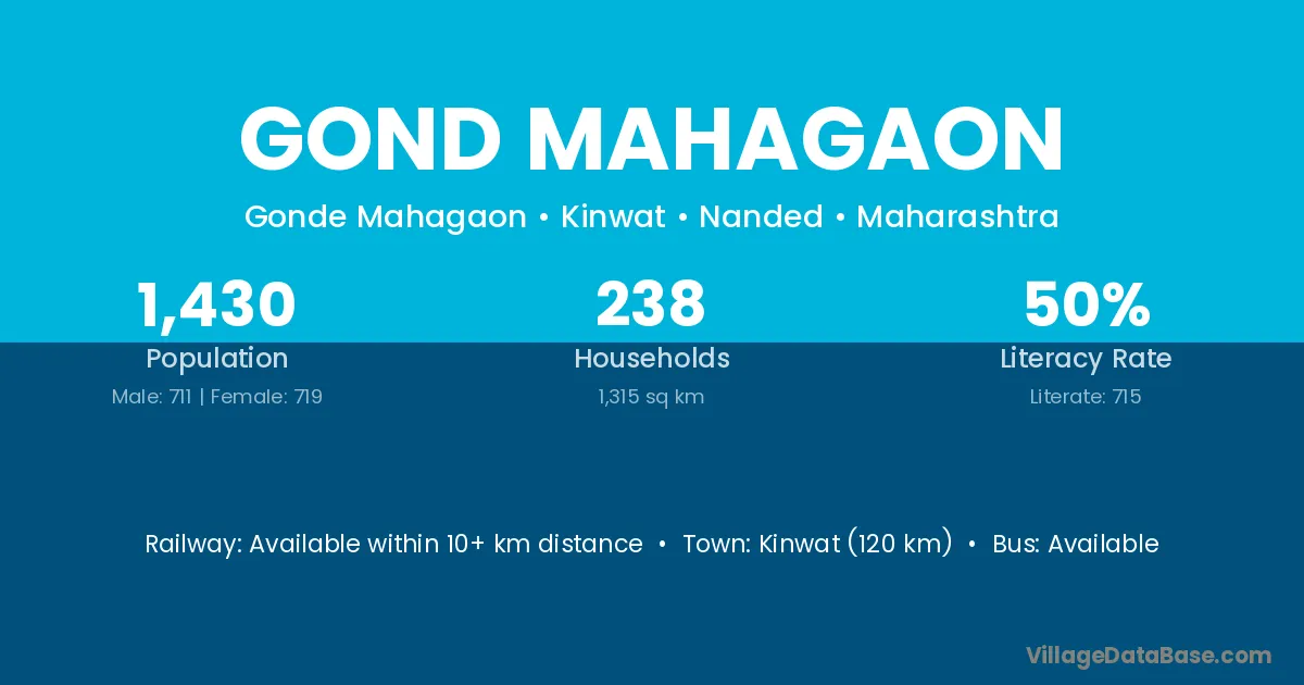Kinwat (120 km) is the nearest town to Gond Mahagaon village for major economic activities and is located approximately 120 km away.