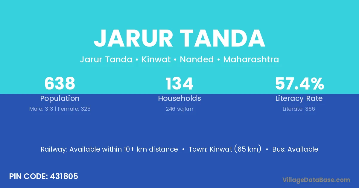 Kinwat (65 km) is the nearest town to Jarur Tanda village for major economic activities and is located approximately 65 km away.