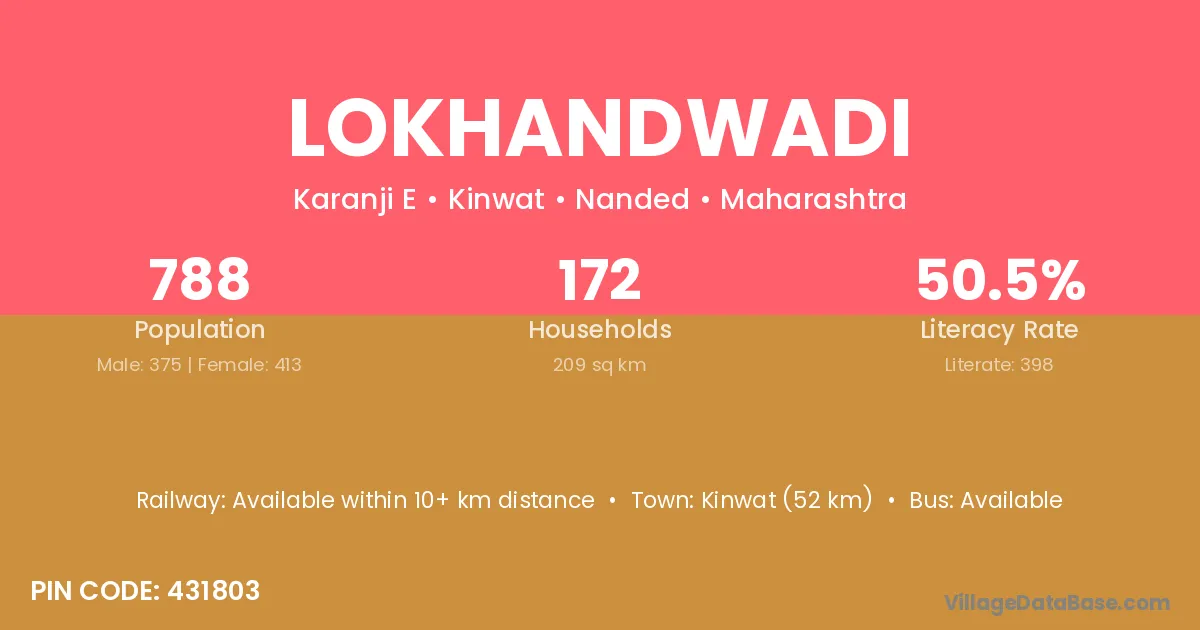 Kinwat (52 km) is the nearest town to Lokhandwadi village for major economic activities and is located approximately 52 km away.