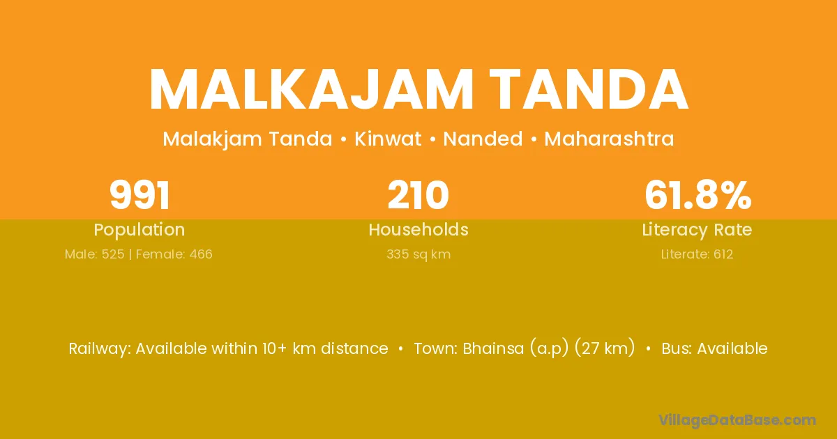 Bhainsa (a.p) (27 km) is the nearest town to Malkajam Tanda village for major economic activities and is located approximately 27 km away.