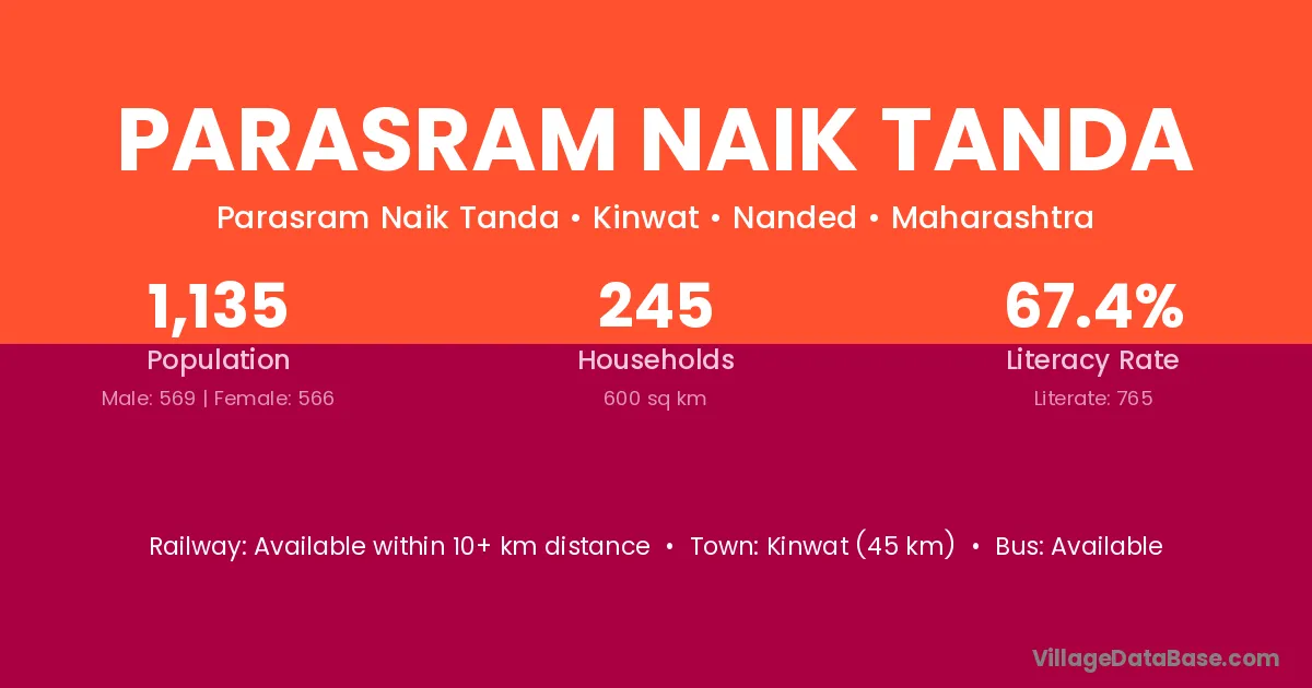 Parasram Naik Tanda village has a total population of 1,135 people, of which 569 are males and 566 are females.