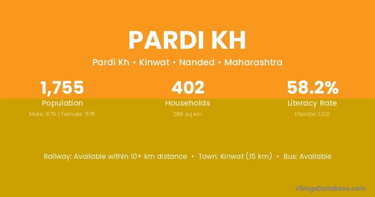Kinwat (15 km) is the nearest town to Pardi Kh village for major economic activities and is located approximately 15 km away.