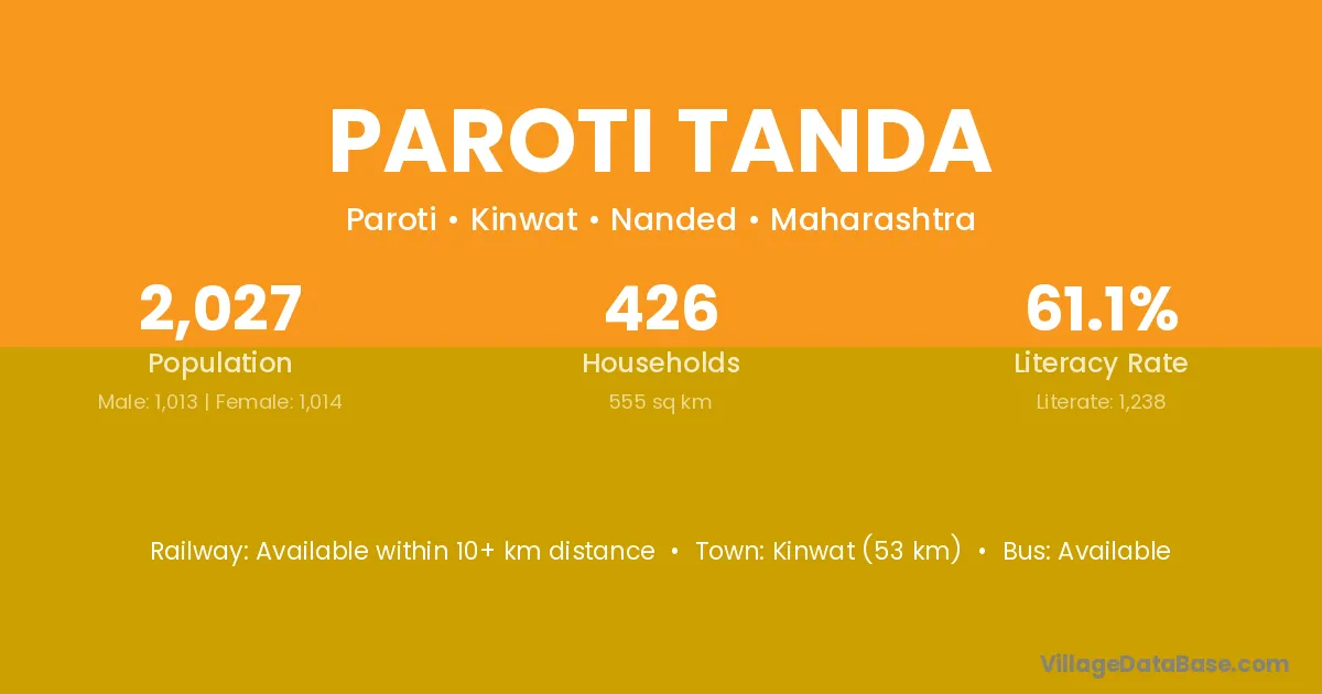 Kinwat (53 km) is the nearest town to Paroti Tanda village for major economic activities and is located approximately 53 km away.