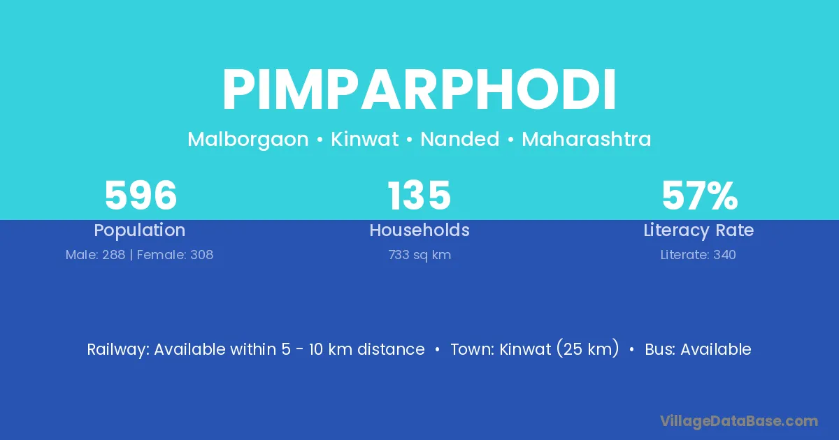 Kinwat (25 km) is the nearest town to Pimparphodi village for major economic activities and is located approximately 25 km away.
