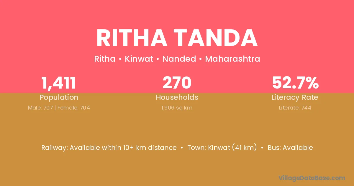 Kinwat (41 km) is the nearest town to Ritha Tanda village for major economic activities and is located approximately 41 km away.