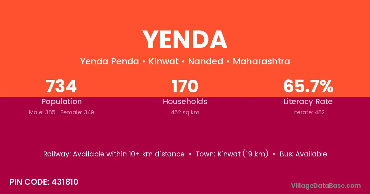 Kinwat (19 km) is the nearest town to Yenda village for major economic activities and is located approximately 19 km away.