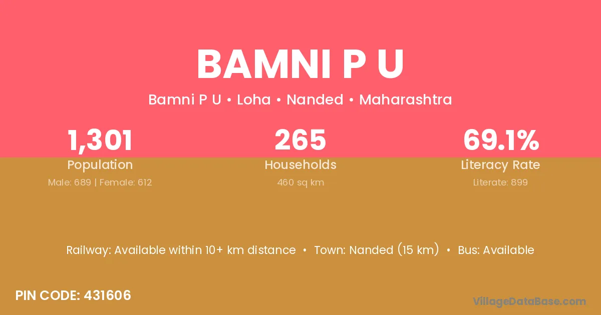 Nanded (15 km) is the nearest town to Bamni P U village for major economic activities and is located approximately 15 km away.