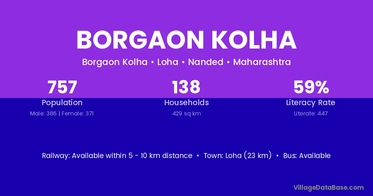 Loha (23 km) is the nearest town to Borgaon Kolha village for major economic activities and is located approximately 23 km away.