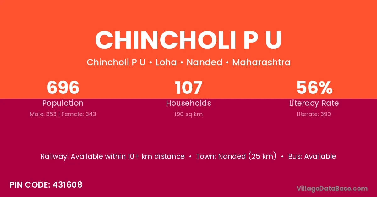 Nanded (25 km) is the nearest town to Chincholi P U village for major economic activities and is located approximately 25 km away.