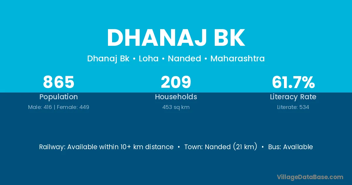 Nanded (21 km) is the nearest town to Dhanaj Bk village for major economic activities and is located approximately 21 km away.