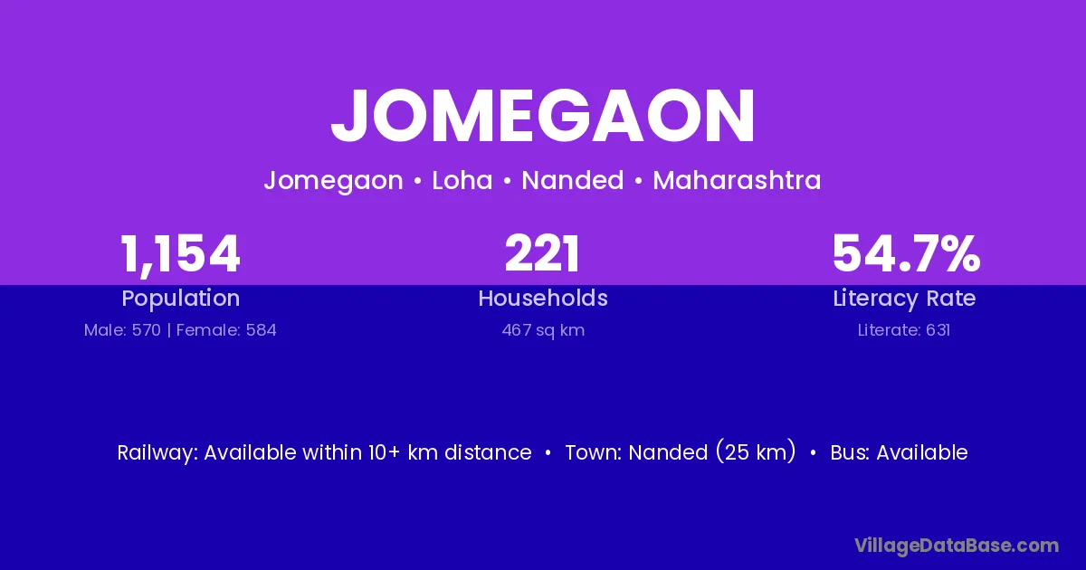 Nanded (25 km) is the nearest town to Jomegaon village for major economic activities and is located approximately 25 km away.