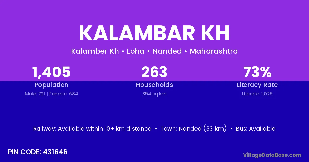 Nanded (33 km) is the nearest town to Kalambar Kh village for major economic activities and is located approximately 33 km away.