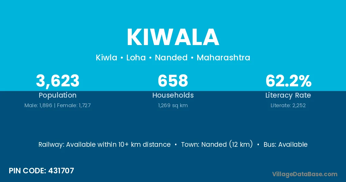 Nanded (12 km) is the nearest town to Kiwala village for major economic activities and is located approximately 12 km away.