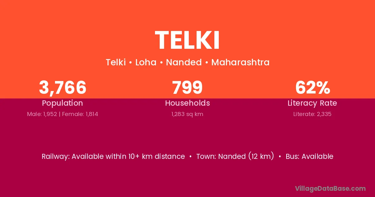 Nanded (12 km) is the nearest town to Telki village for major economic activities and is located approximately 12 km away.
