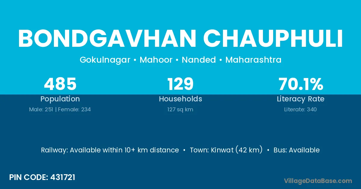 Kinwat (42 km) is the nearest town to Bondgavhan Chauphuli village for major economic activities and is located approximately 42 km away.