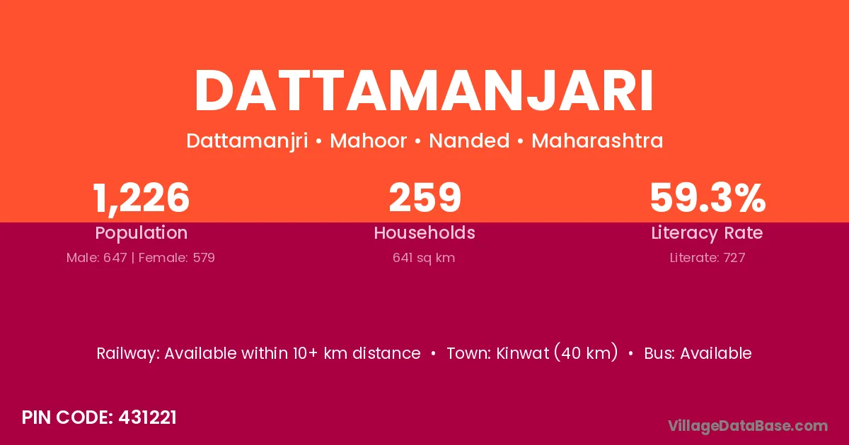 Kinwat (40 km) is the nearest town to Dattamanjari village for major economic activities and is located approximately 40 km away.