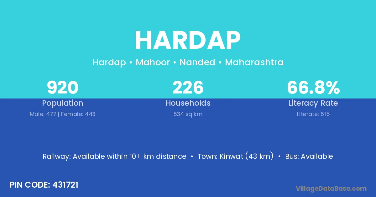 Kinwat (43 km) is the nearest town to Hardap village for major economic activities and is located approximately 43 km away.