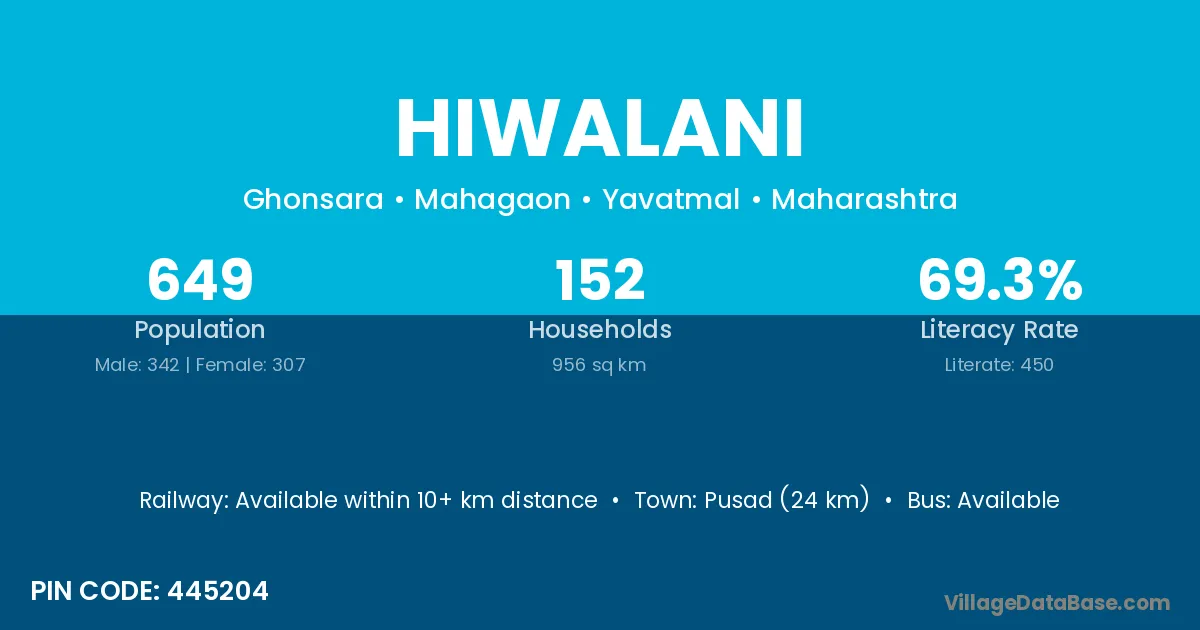 Kinwat (40 km) is the nearest town to Hiwalani village for major economic activities and is located approximately 40 km away.
