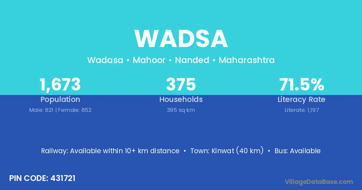 Kinwat (40 km) is the nearest town to Wadsa village for major economic activities and is located approximately 40 km away.
