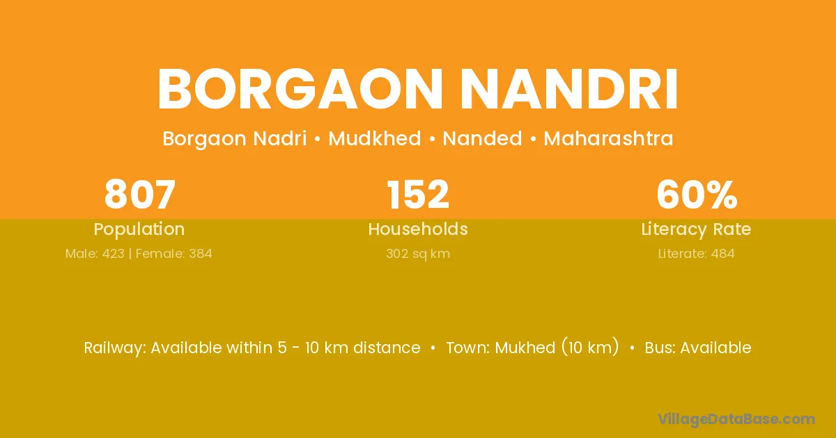 Mukhed (10 km) is the nearest town to Borgaon Nandri village for major economic activities and is located approximately 10 km away.