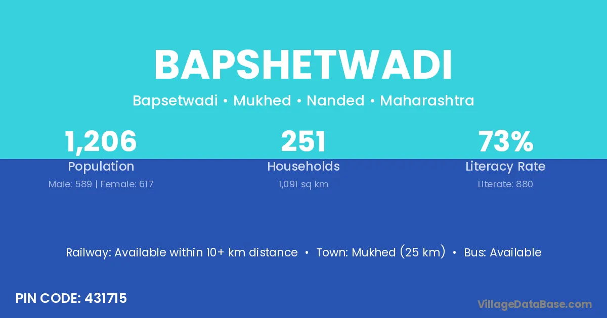 Mukhed (25 km) is the nearest town to Bapshetwadi village for major economic activities and is located approximately 25 km away.