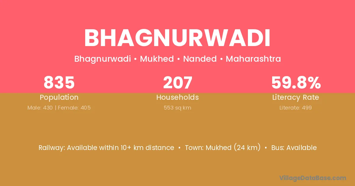 Mukhed (24 km) is the nearest town to Bhagnurwadi village for major economic activities and is located approximately 24 km away.