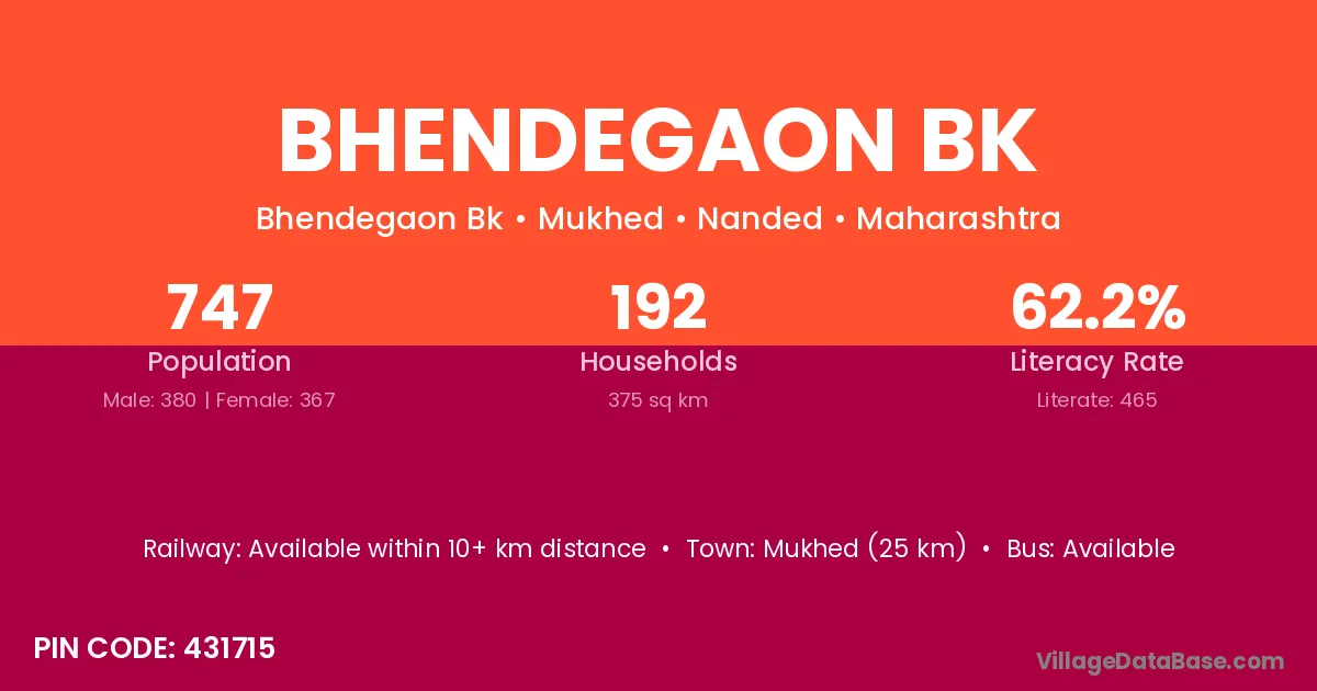 Bhendegaon Bk village has a total population of 747 people, of which 380 are males and 367 are females.