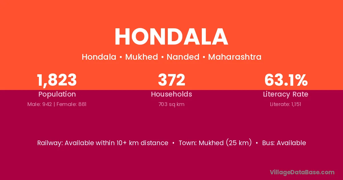 Mukhed (25 km) is the nearest town to Hondala village for major economic activities and is located approximately 25 km away.