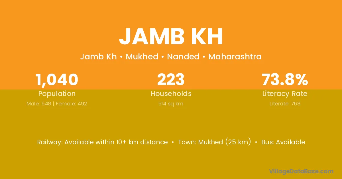 Mukhed (25 km) is the nearest town to Jamb Kh village for major economic activities and is located approximately 25 km away.
