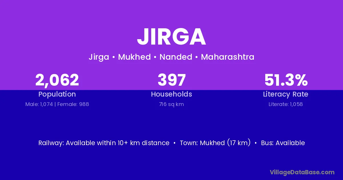 Mukhed (17 km) is the nearest town to Jirga village for major economic activities and is located approximately 17 km away.