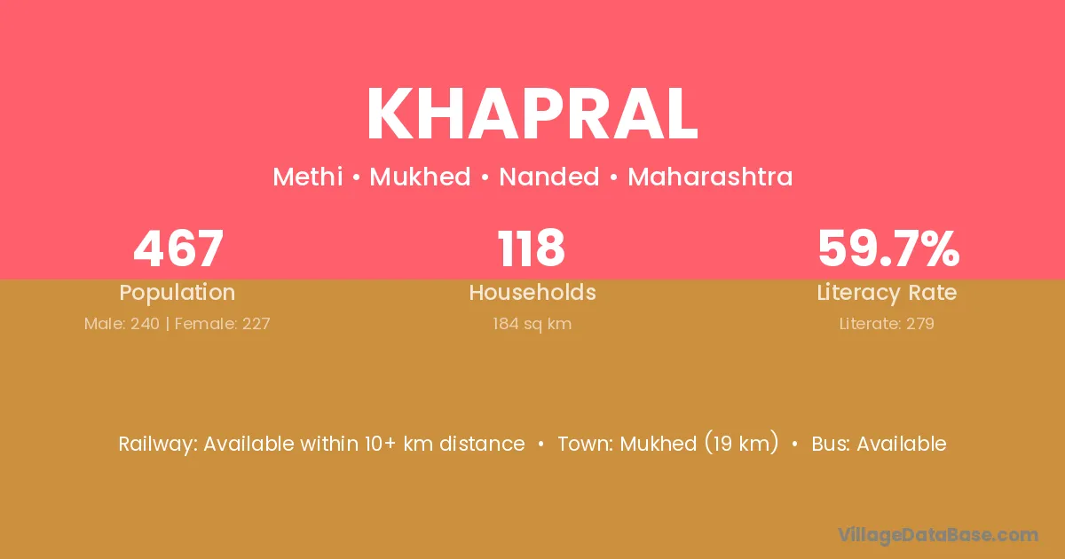Mukhed (19 km) is the nearest town to Khapral village for major economic activities and is located approximately 19 km away.
