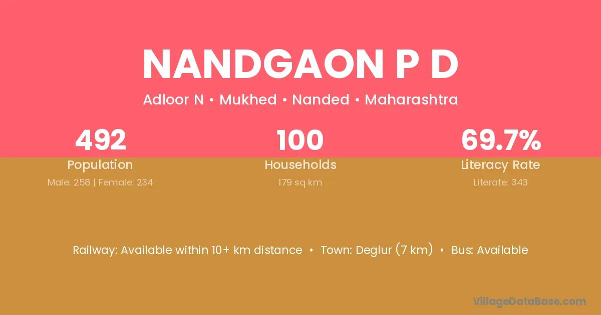 Deglur (7 km) is the nearest town to Nandgaon P D village for major economic activities and is located approximately 7 km away.