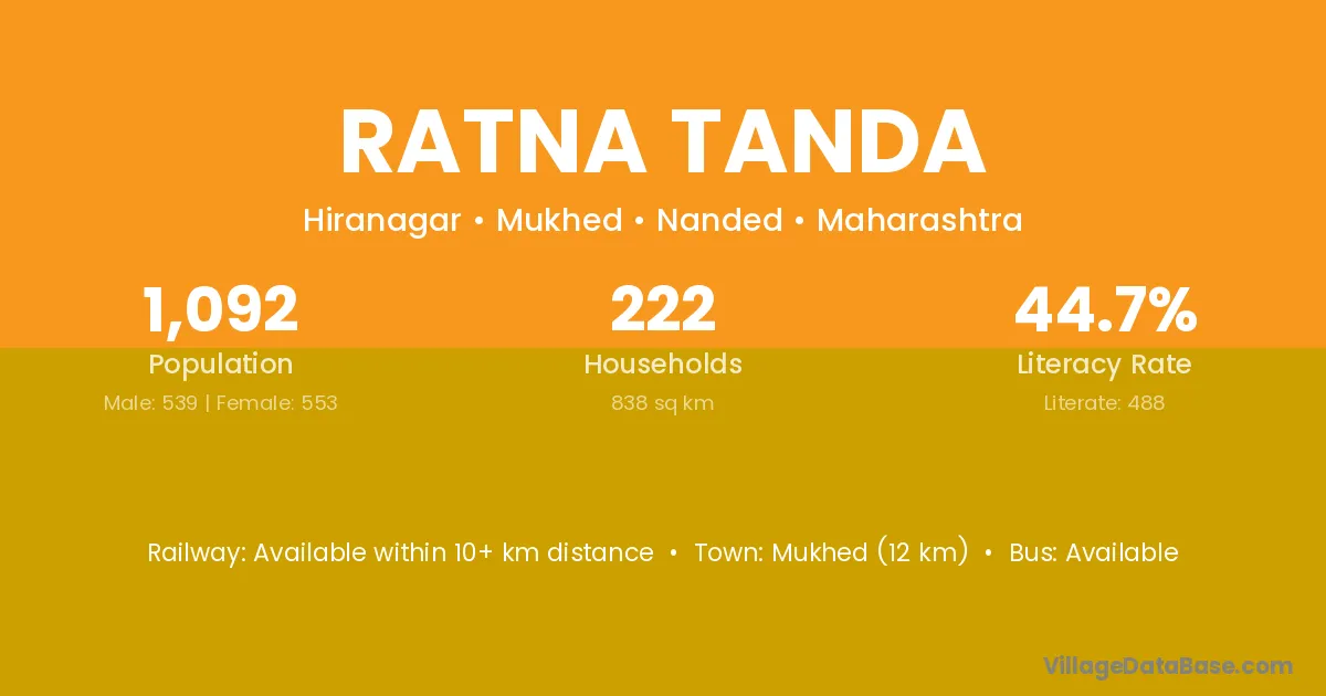 Mukhed (12 km) is the nearest town to Ratna Tanda village for major economic activities and is located approximately 12 km away.