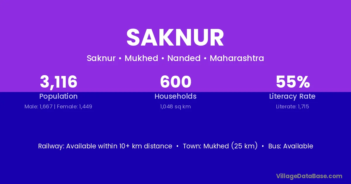 Mukhed (25 km) is the nearest town to Saknur village for major economic activities and is located approximately 25 km away.