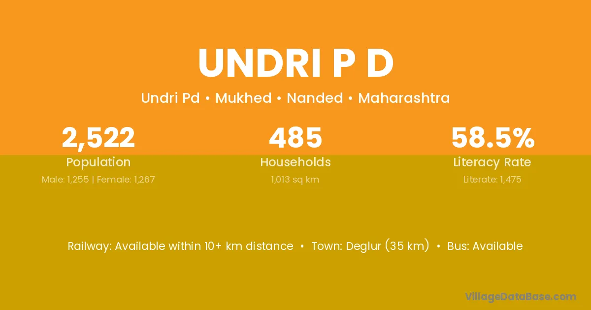 Deglur (35 km) is the nearest town to Undri P D village for major economic activities and is located approximately 35 km away.