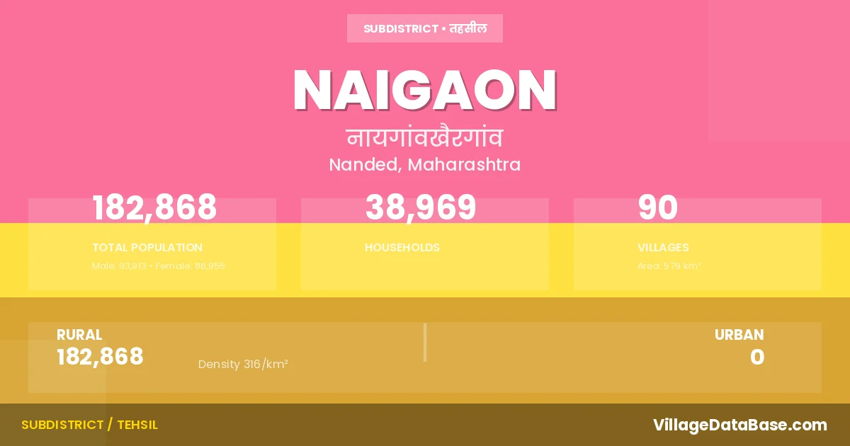 According to the 2011 census The total area of Naigaon Tehsil is 579 km², with a population of 182868 people. The population density is 316 inhabitants per square kilometre, and there are approximately 38969 houses in the sub district.