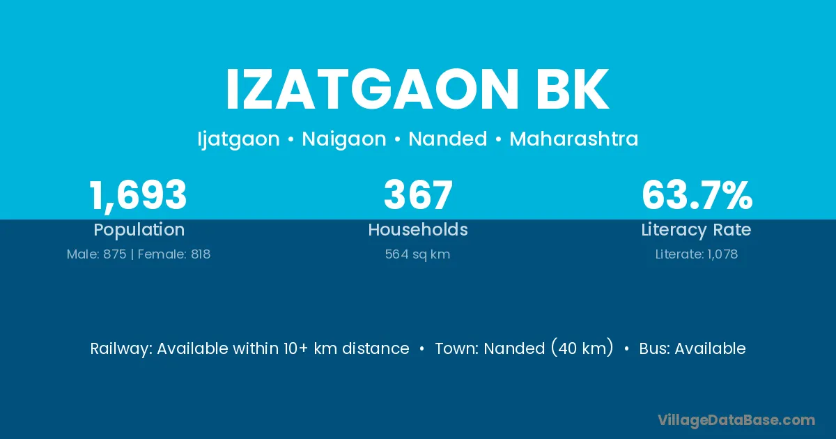 Nanded (40 km) is the nearest town to Izatgaon Bk village for major economic activities and is located approximately 40 km away.