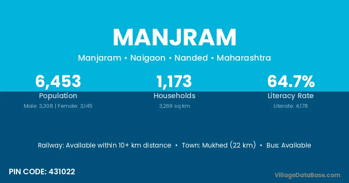 Mukhed (22 km) is the nearest town to Manjram village for major economic activities and is located approximately 22 km away.
