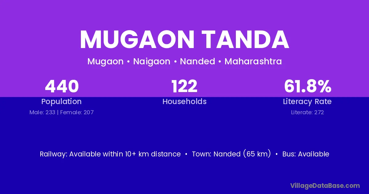 Nanded (65 km) is the nearest town to Mugaon Tanda village for major economic activities and is located approximately 65 km away.