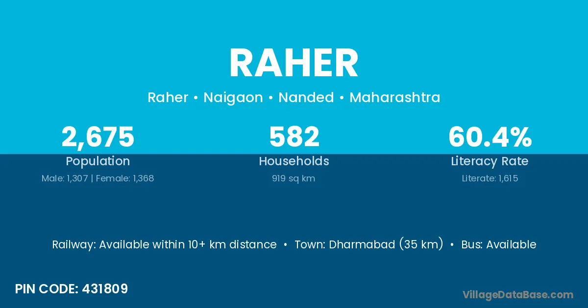Dharmabad (35 km) is the nearest town to Raher village for major economic activities and is located approximately 35 km away.
