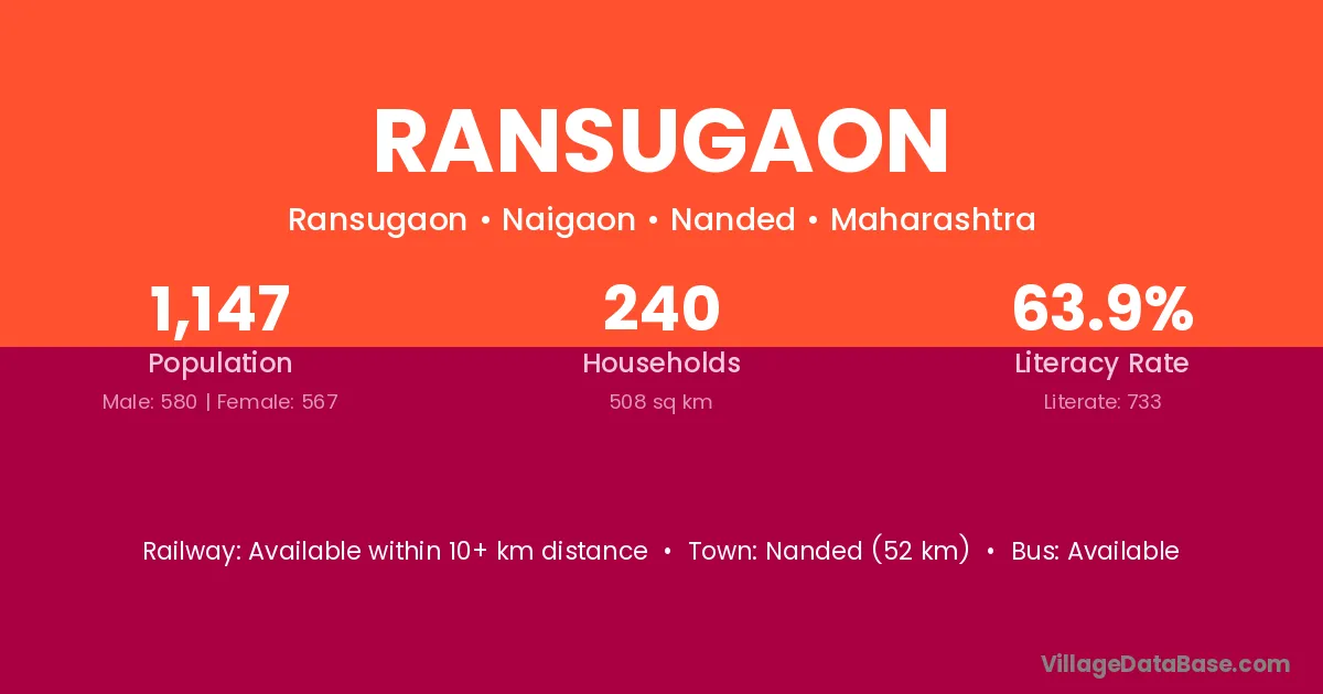 Nanded (52 km) is the nearest town to Ransugaon village for major economic activities and is located approximately 52 km away.