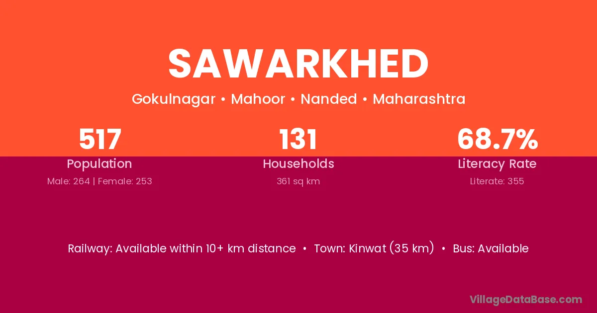 Nanded (14 km) is the nearest town to Sawarkhed village for major economic activities and is located approximately 14 km away.