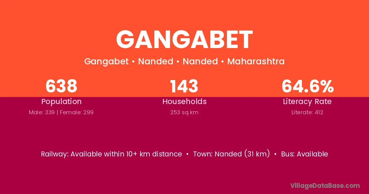Nanded (31 km) is the nearest town to Gangabet village for major economic activities and is located approximately 31 km away.