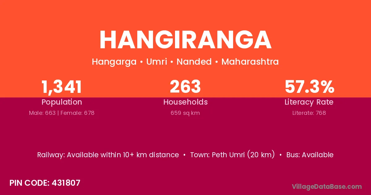 Peth Umri (20 km) is the nearest town to Hangiranga village for major economic activities and is located approximately 20 km away.