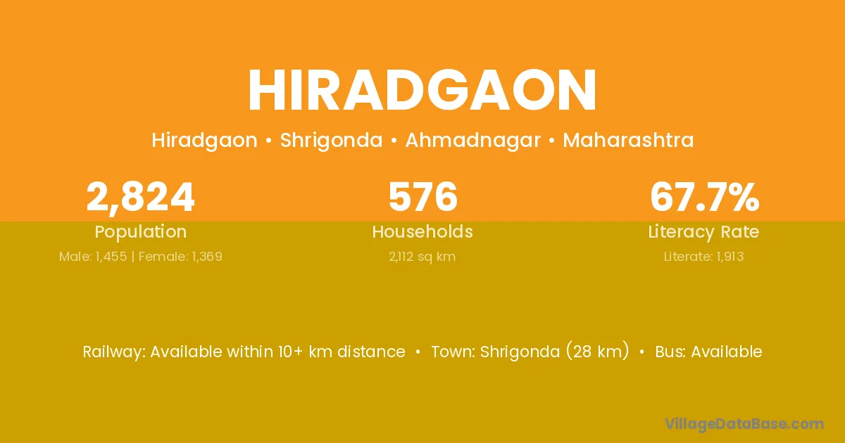 Peth Umri (3 km) is the nearest town to Hiradgaon village for major economic activities and is located approximately 3 km away.